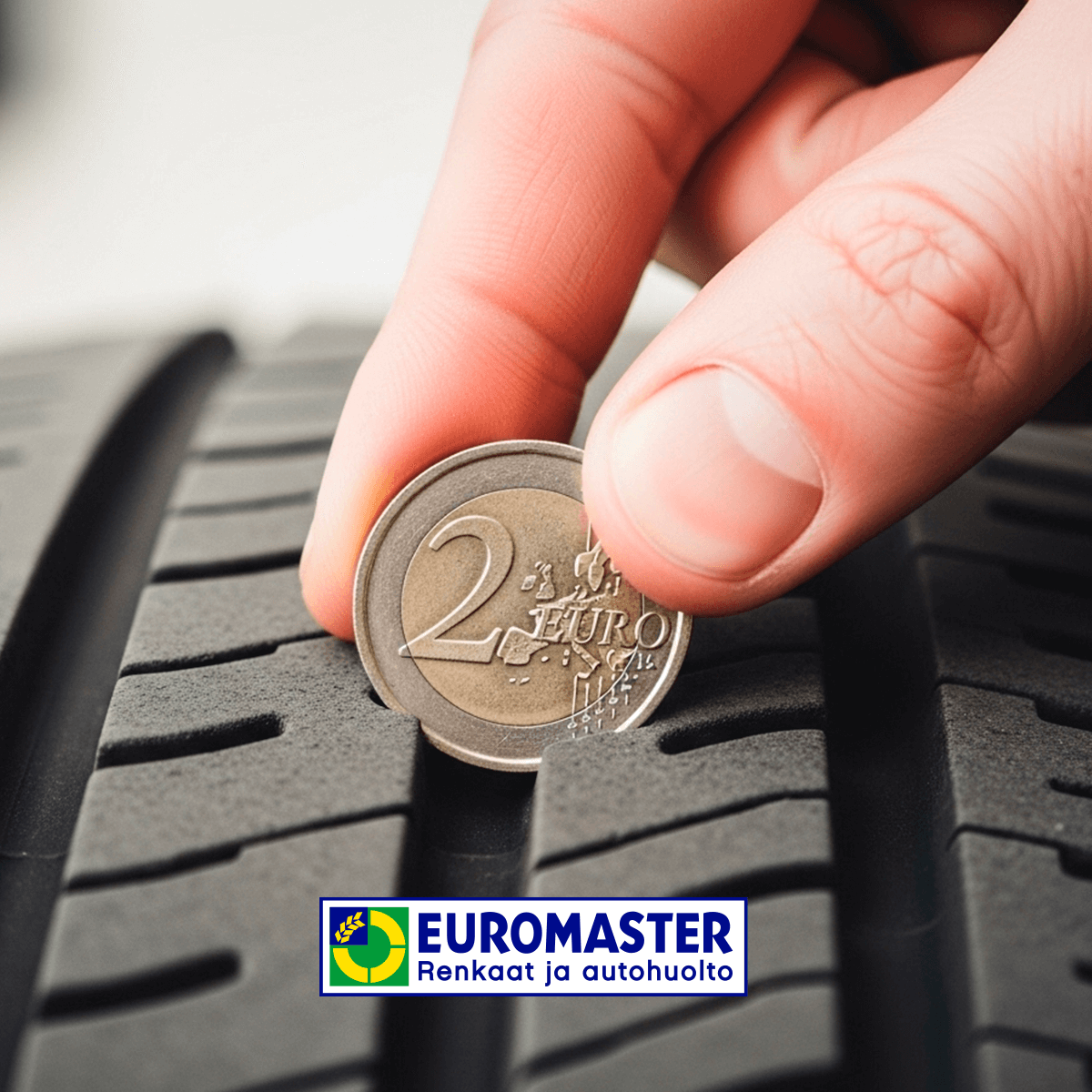 Urasyvyyden tarkistaminen on helppoa. Yksinkertainen tapa on kahden euron kolikko. Aseta kolikko renkaan pääuraan niin, että kolikon hopeinen reuna on kokonaan upoksissa. Jos kolikon reunaa jää näkyviin, renkaan urasyvyys on liian pieni. Muista tarkistaa useampi kohta renkaasta, koska kuluminen voi olla epätasaista.